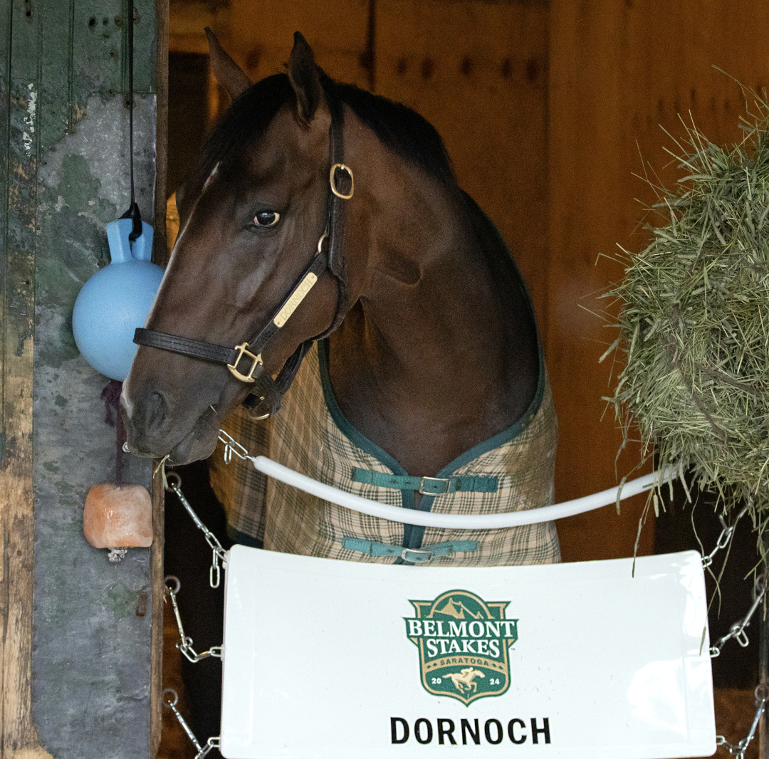 SARATOGA SPRINGS, N.Y - While heavy rain fell outside his barn Sunday morning, Dornoch was inside his stall attacking his hay net early with an energy belying the fact he just ran a hard race to win Saturday’s $2 million Belmont Stakes.