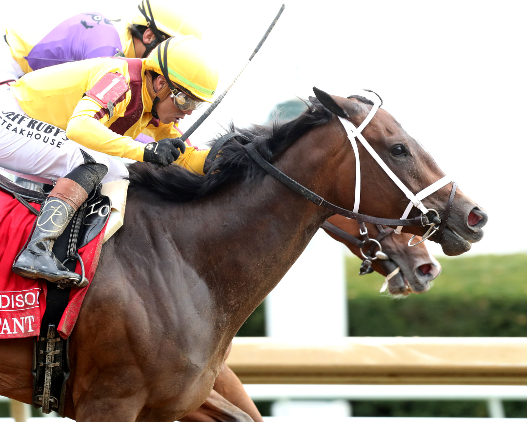 Grand Job, regularly a pacesetter, likes to get on with her business, but Junior Alvarado managed to hold her a length or a length-and-a-half off R Disaster’s pace. When Eclatant loomed up at the five-sixteenths marker, Alvarado played his hand and Grand Job rapidly overhauled R Disaster. She was not stopping, either, and at the wire, the decision was too close to call.