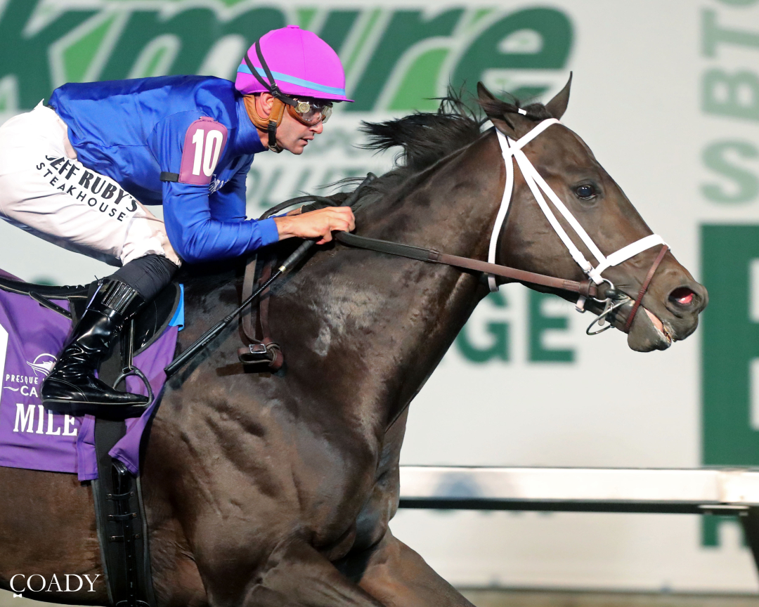 The Presque Isle Mile’s name is a bit of a misnomer, as the race is actually contested at 1 1/16 miles due to track configuration. The time was 1:42.24.