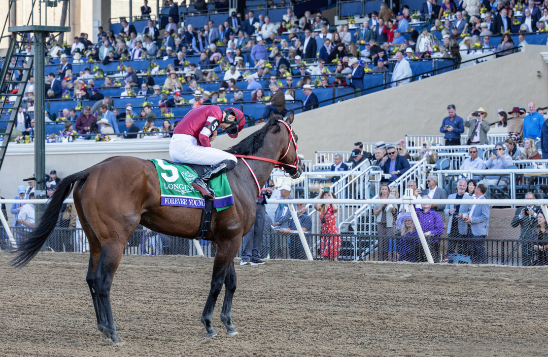A 5-year-old in 2026, Forever Young has won 10 of 13 starts and more than $19.3 million. In 2024, Forever Young was third by a head in the Kentucky Derby and third in the BC Classic at Del Mar.