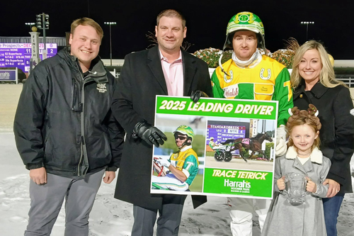 Winter weather conditions forced the cancellation of the closing night card after five races on Saturday (Nov. 29) at Harrah's Hoosier Park, but not before Trace Tetrick and Tyler George made their annual trek to the winner's circle to be honored as the leading driver and trainer, respectively, once again in 2025.