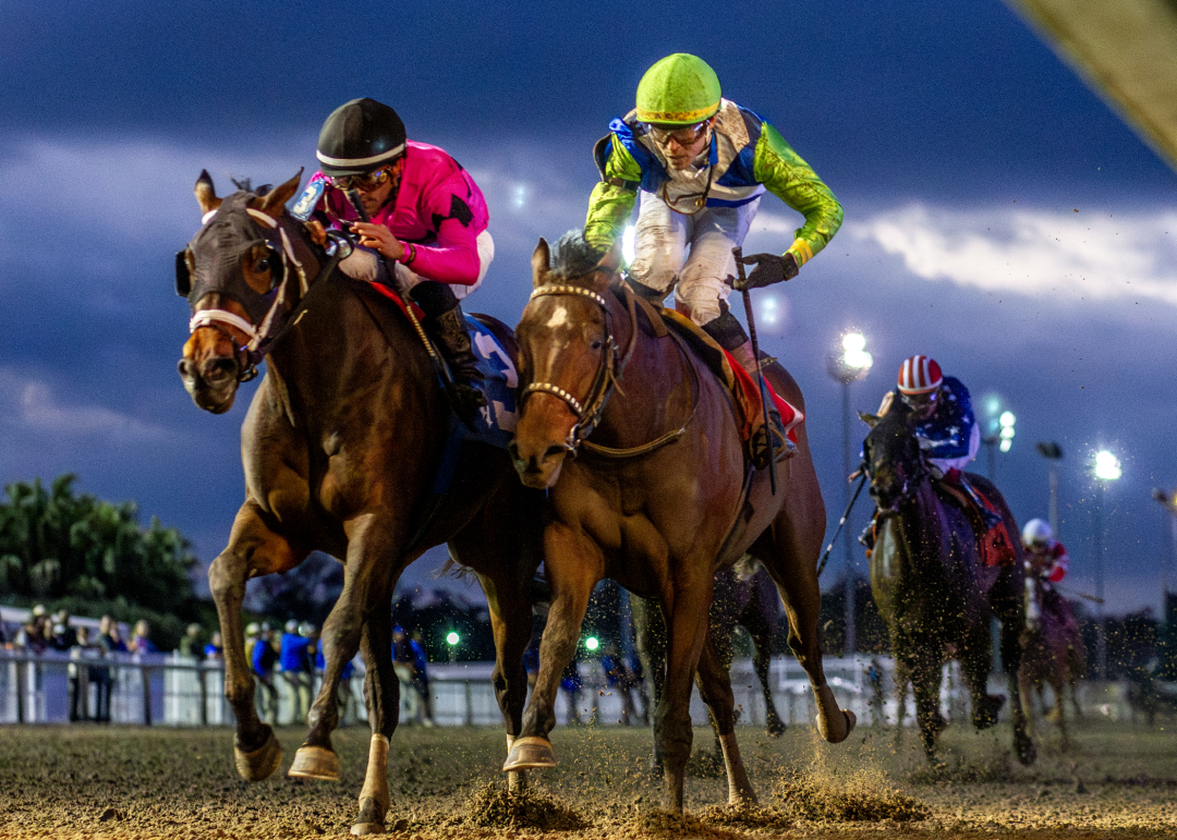 Hit Parade was all out to get her nose down over Luv Your Neighbor, who somehow managed to come within a head of winning despite jockey Axel Concepcion losing his right stirrup at the three-sixteenths marker. Leaning dramatically left, Concepcion still kept his mount right in the game, Luv Your Neighbor finishing bravely along the fence, Hit Parade outside her and just narrowly better Saturday.