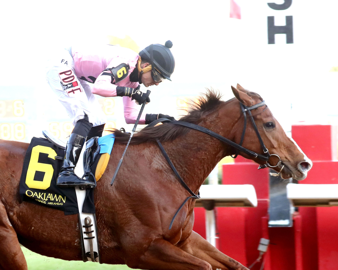 “I was glad we were on the outside,” winning trainer Darrin Miller said in an interview conducted by Oaklawn. “That helped us a bunch.