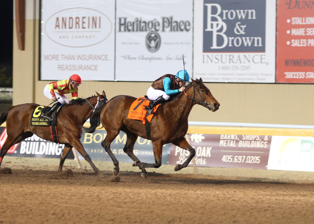 The She’s All In was the third stakes win at the meet for Miss Code West. She was facing open company in the race after winning the Bob Barry Memorial and the Oklahoma Distaff Turf, both for Oklahoma-breds, earlier this season at Remington.