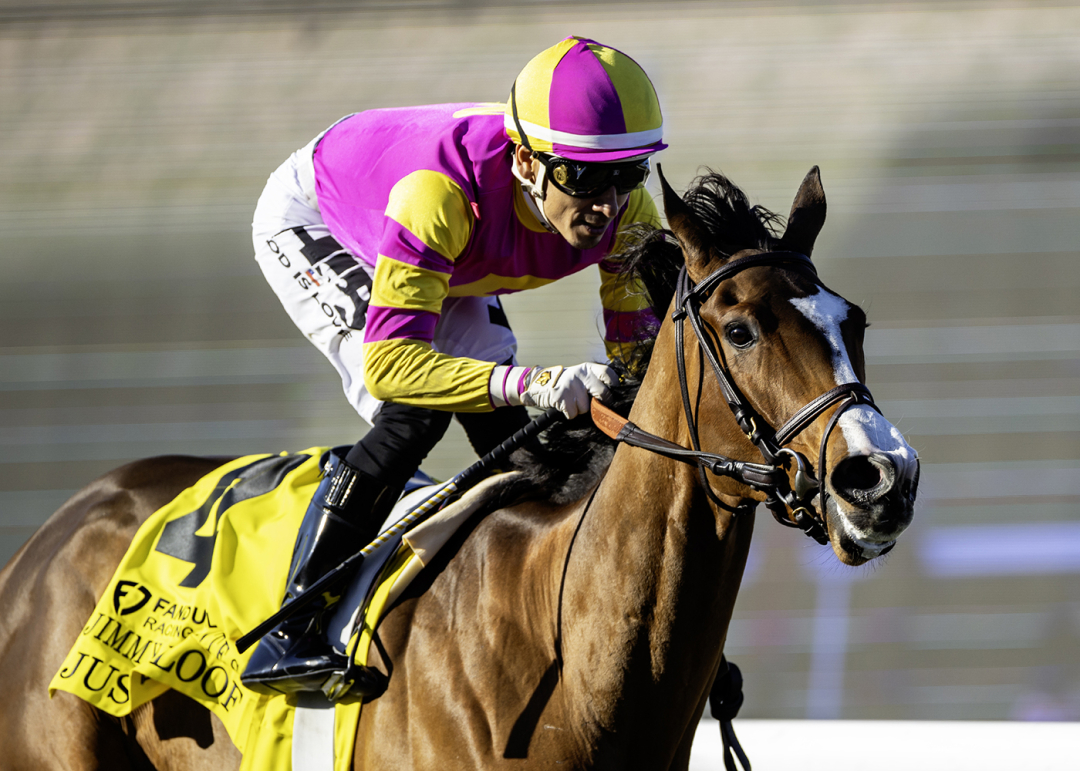 The $103,000 Jimmy Durante Stakes was Just Aloof’s second win in as many starts. Trained by Chad Brown for Whisper Hill Farm, Just Aloof won a maiden race at a mile on turf at Aqueduct on Oct. 16 with an eye-catching rally in the final furlong. By Justify, Just Aloof has earned $106,750.