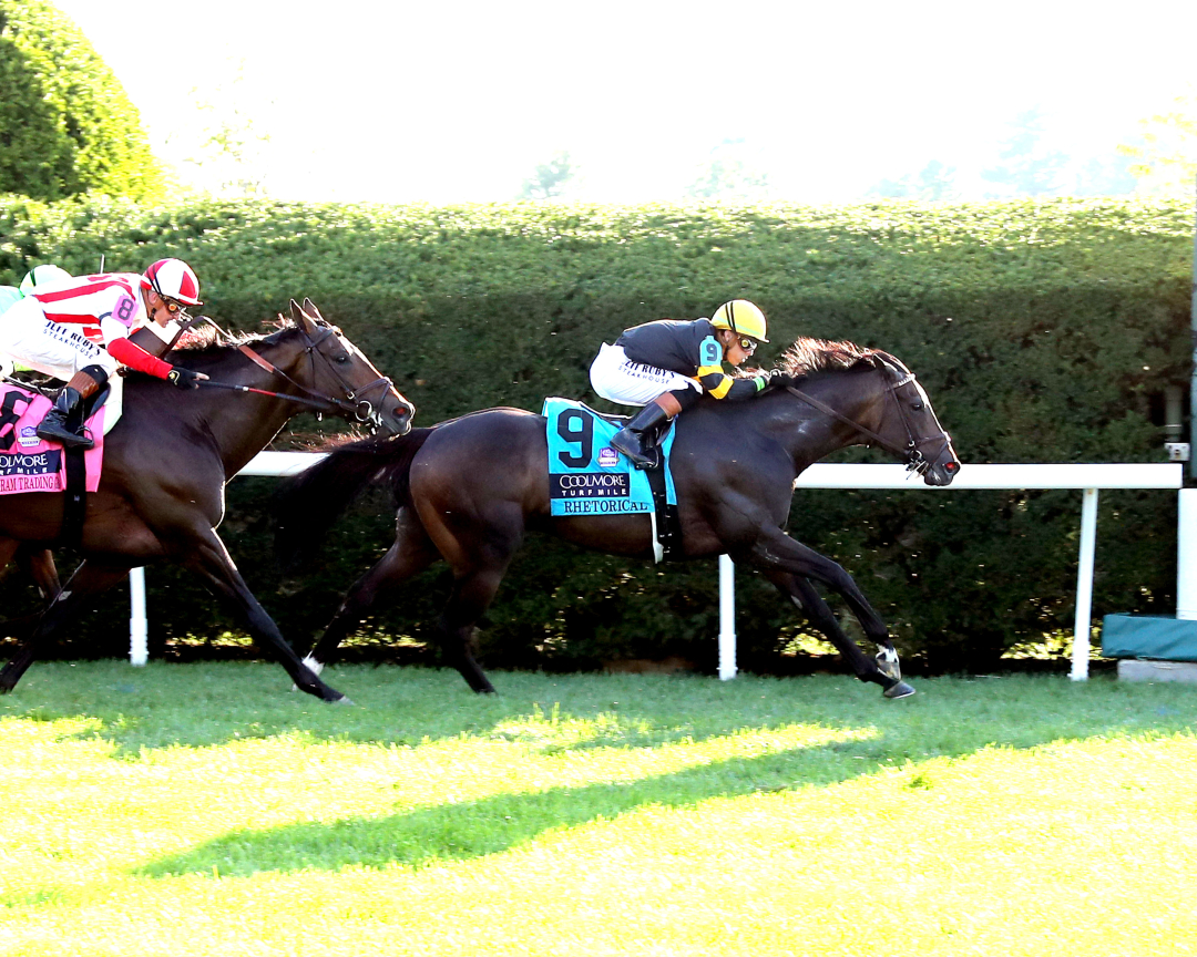 Ortiz gave Rhetorical a perfect trip, and Rhetorical gave Ortiz plenty. Rhetorical broke sharply, was four wide and right with the pace 50 yards into the Turf Mile, but Ortiz gently pulled the reins and steered left, plunking Rhetorical down in fourth, saving ground a few lengths behind three horses – Quatrocento, Howard Wolowitz, and Epic Ride – who sprinted around the turn and onto the backstretch. The quarter-mile went in 22.40, the half in a testing 46.07, and at the five-sixteenths marker, the turn for home looming, Ortiz said go, and Rhetorical went.