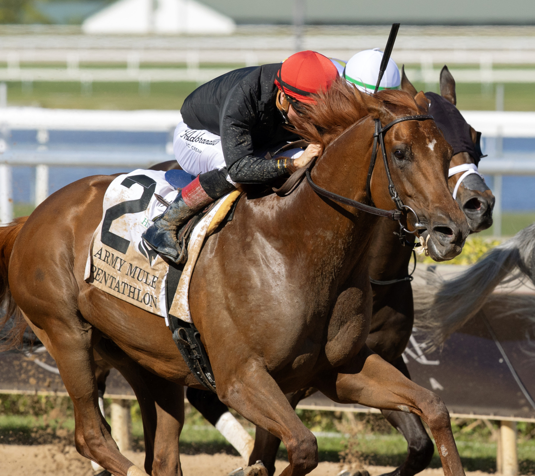 HALLANDALE BEACH, Fla. – A frustrating winter at Gulfstream Park became a little more tolerable for trainer Shug McGaughey on Saturday after Pentathlon won the $175,000 Army Mule Stakes by a half-length over Back Em Up.