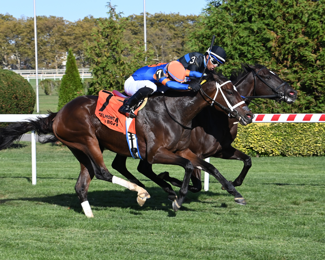 Spirit of New York ($6.30) on Saturday settled just off pacemaker Funny Factor, who took the field through an opening quarter in 22.50 seconds and the half-mile in 45.25. Spirit of New York came three wide into the stretch and dug in to the wire, while covering six furlongs on firm turf in 1:08.55.