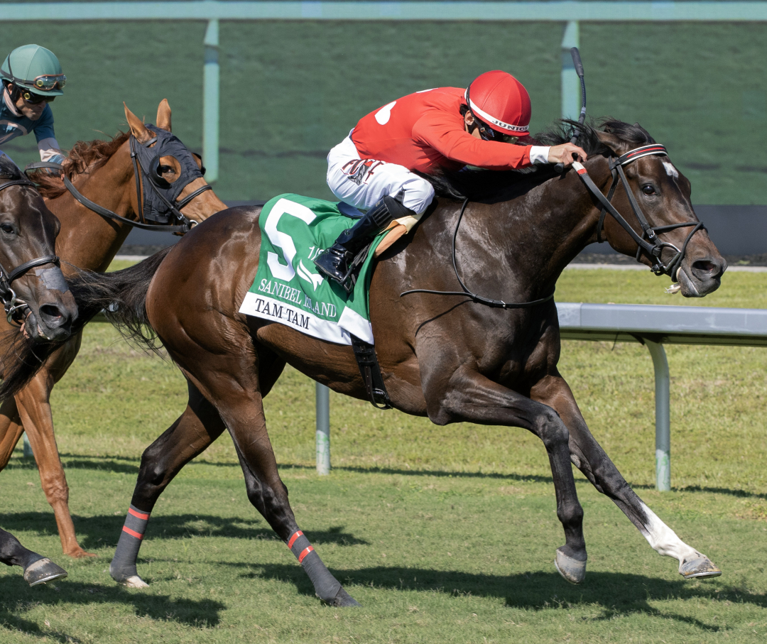 HALLANDALE BEACH, Fla. – Tam Tam, who has improved dramatically since making the switch from dirt to turf at the beginning of her 3-year-old campaign, remained perfect on the grass after rallying to a neck victory over Connect the Stars in Saturday’s $125,000 Sanibel Island for 3-year-old fillies at Gulfstream Park.