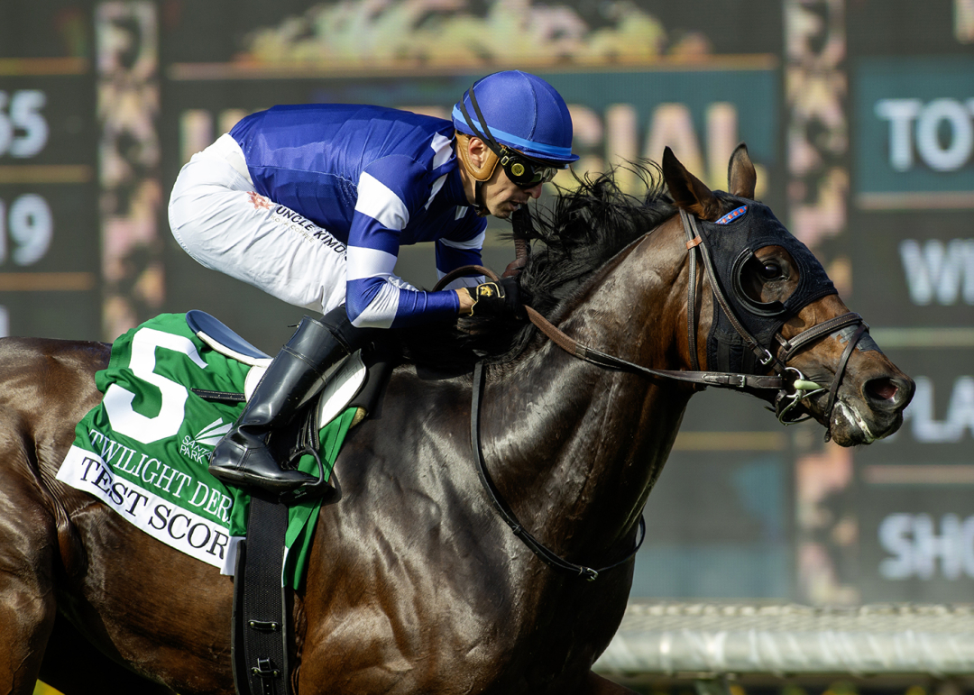 ARCADIA, Calif. - Fitted with blinkers for the first time, Test Score was back to familiar habits in Saturday’s Grade 2 Twilight Derby at Santa Anita – winning his third graded stakes of 2025.